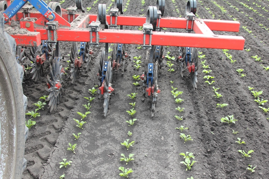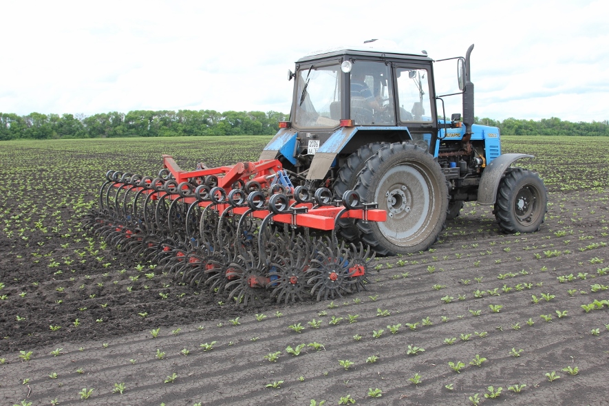 Такое рыхление почвы разрушает капилляры, увеличивает ее пористость, чем способствует равномерному распределению кислорода и влаги, что также способствует укреплению растения и ускоренному росту. Для междурядной обработки можно снять часть стоек, чтобы не повреждать растение в рядке. Нашим орудием можно работать от 2 листочков до 20 см, а если увеличить междурядье, то и до высоты растений в 50 см.