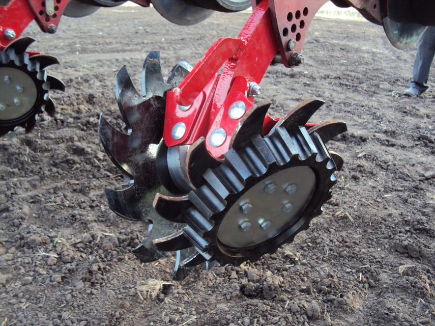 Два вырезных диска со смещением раздвигают растительные остатки и комья почвы и не создают борозды.