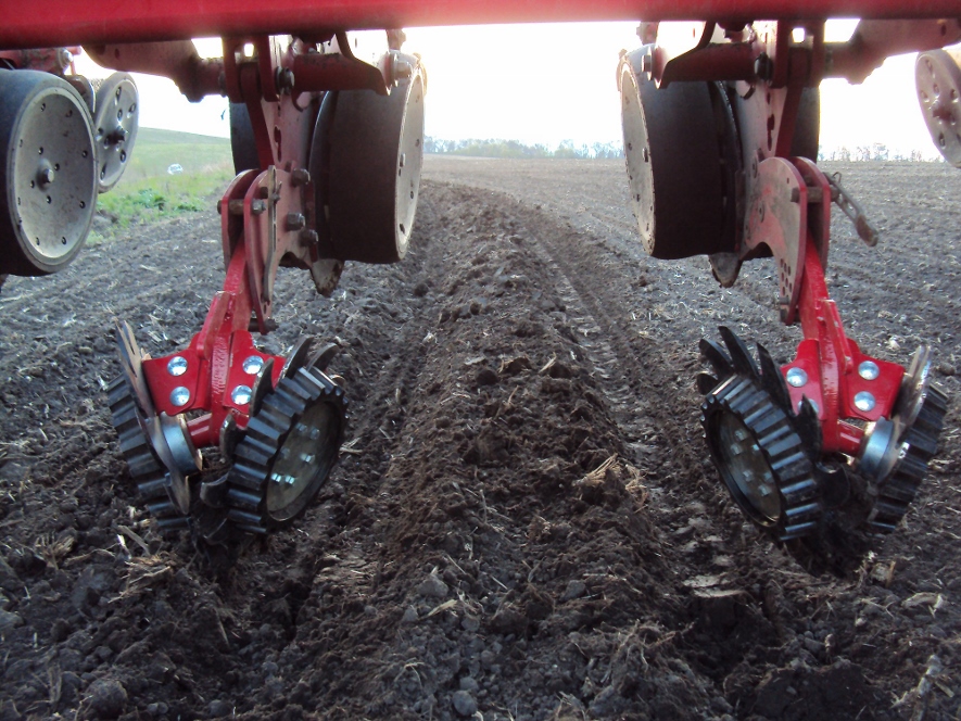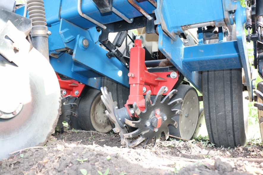 Роторный очиститель рядка АгриФокус АФ-350х10 на сеялке KINZE 3000 при посеве кукурузы по технологии полосовой обработки почвы Стрип-Тилл, заглубление дисков
