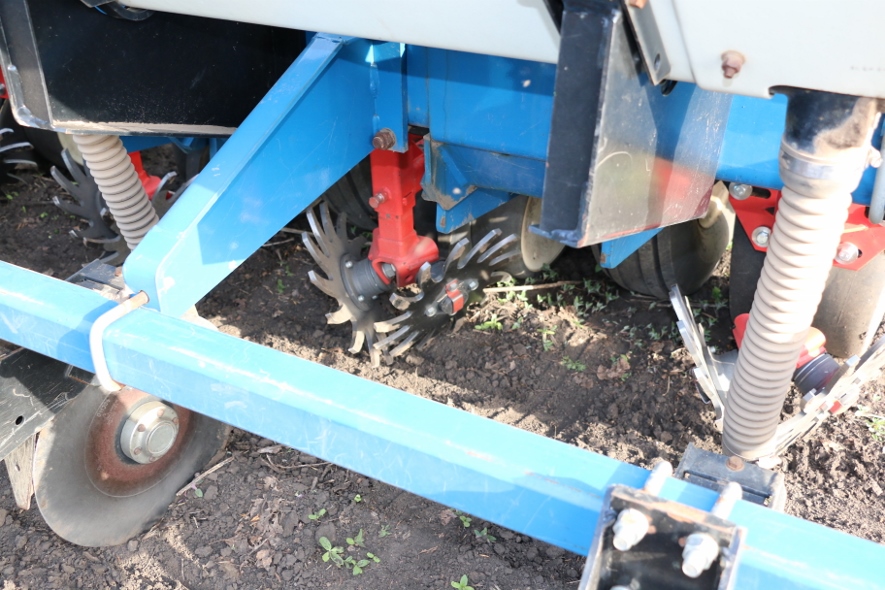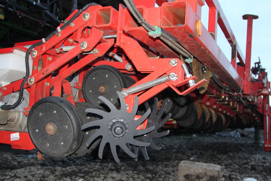 Роторный очиститель рядка АгриФокус АФ-290х8 на сеялке Gaspardo MT при посеве подсолнечника по технологии прямого посева, заглубление дисков очистителя 3-4 см для удаления половы и валков (для увеличения, нажмите на фото)