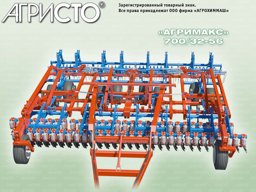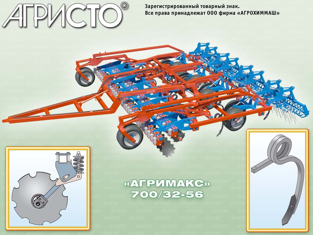 «АГРИМАКС» — многофункциональный комбинированный агрегат, сочетает в себе двухрядную дисковую борону, чизельный плуг, мощную пружинную борону и прикатывающий каток (спиральный или резиновый). Такие комбинированные орудия также называют — дисколаповая борона.