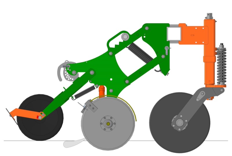 2) КОПИРУЮЩИЙ СОШНИКЗа колторным диском расположен усиленный двудисковый сошник давлением 60-120 кг (давление регулируется пружинами) на параллелограммной навеске с ходом 30см для превосходного копирования почвы. Узлы скольжения на необслуживаемых капролоновых втулках (в комплект поставки входят запасные капролоновые втулки). Диски Ø373мм из износостойкой боросодержащей стали фирмы «OFAS» (Италия). На ступицах дисков применены двухрядные радиально упорные шариковые подшипники FKL увеличенного ресурса с тройной защитой. Междурядье 19см. Важной отличительной особенностью двудискового сошника с опережением одного диска другим и расположенным сзади копирующим колесом является возможность сева по переувлажненной почве в отличии от стерневых сеялок с однодисковым сошником (например 1895 JOHN DEERE, G-600 MONO DISCO CHERARDI TURBOSEM- Агросоюз и т. П.). Копирующее колесо однодискового сошника, расположенное на оси с диском, лучше копируют почву, но сильнее забивается при влажной и липкой почве. А наши двудисковые сошники ещё и оборудованы наружными и внутренними чистиками для лучшего сева в переувлажненную почву.